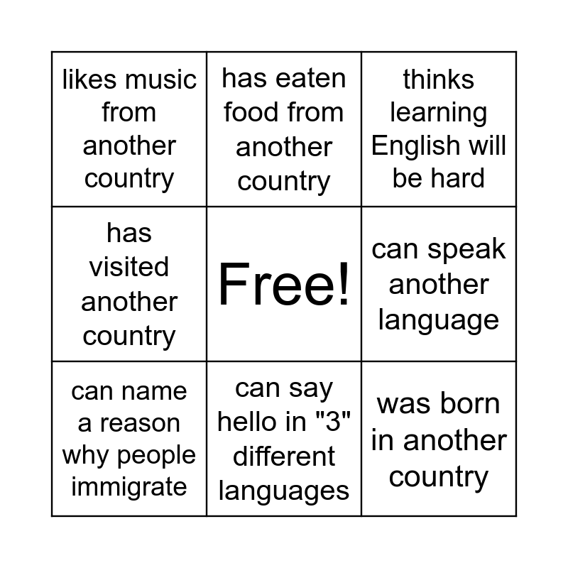 This bingo card has a free space and 16 words: has a family who immigrated, likes learning new languages, thinks learning English will be hard, likes music from another country, can say "hello" in 3 different languages, has eaten food from another country, knows what a green card is, can list 3 countries people migrate from, was born in another country, can speak another language, knows someone who moved to the U.S, has visited another country, talked to someone who speaks another language, can say hello in "3" different languages, can name a reason why people immigrate and has watched a movie about immigration.