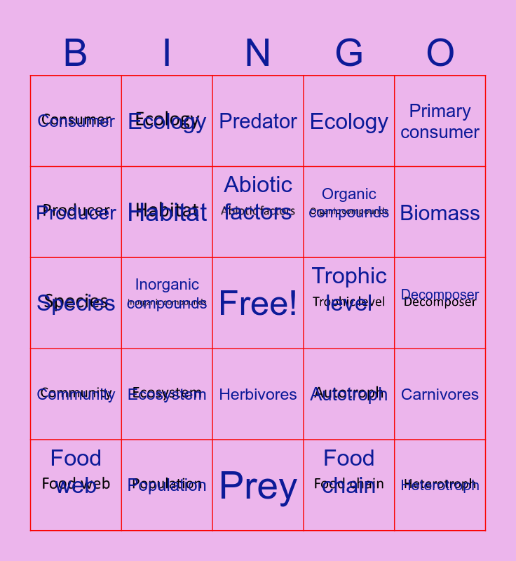 This bingo card has 17 images, a free space and 24 words: Ecosystem, Population, Abiotic factors, Food web, Primary consumer, Consumer, Producer, Ecology, Trophic level, Herbivores, Organic compounds, Species, Autotroph, Carnivores, Habitat, Food chain, Decomposer, Predator, Biomass, Inorganic compounds, Heterotroph, Community, Ecology and Prey.