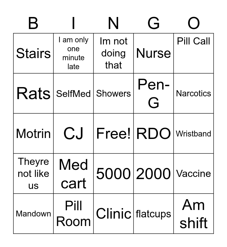 This bingo card has a free space and 24 words: Med cart, Pill Room, Showers, Mandown, Pill Call, Stairs, Rats, I am only one minute late, RDO, 5000, Pen-G, Motrin, 2000, Vaccine, SelfMed, flatcups, Wristband, Im not doing that, Narcotics, CJ, Am shift, Theyre not like us, Nurse and Clinic.
