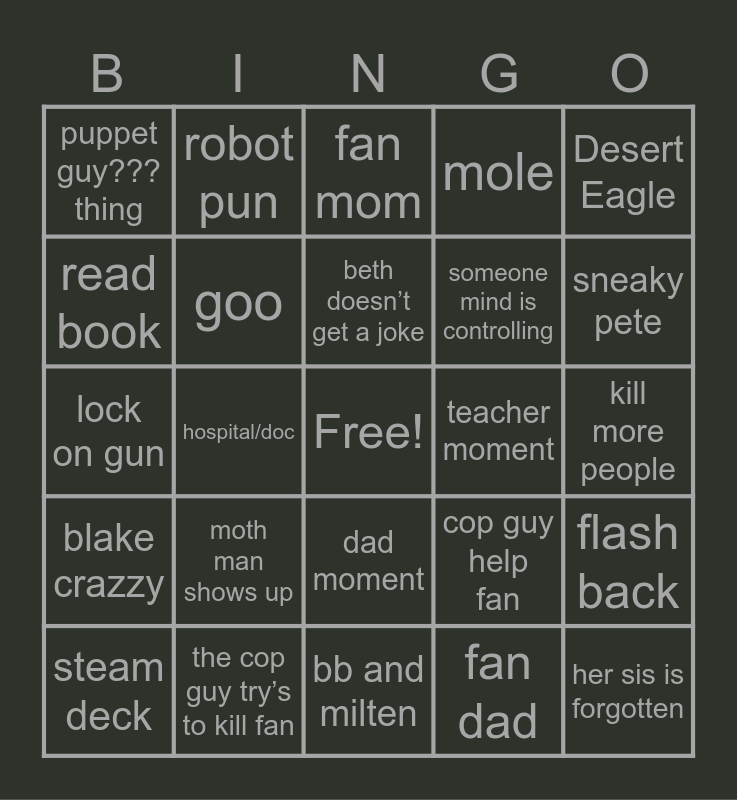 This bingo card has a free space and 24 words: moth man shows up, the cop guy try’s to kill fan, beth doesn’t get a joke, steam deck, Desert Eagle, puppet guy??? thing, read book, robot pun, teacher moment, dad moment, someone mind is controlling, lock on gun, cop guy help fan, flash back, goo, fan dad, kill more people, fan mom, sneaky pete, hospital/doc, her sis is forgotten, blake crazzy, mole and bb and milten.