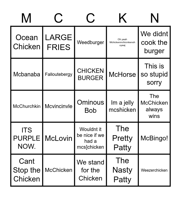 This bingo card has a free space and 24 words: McLovin, McChicken, CHICKEN BURGER, Cant Stop the Chicken, We didnt cook the burger, Ocean Chicken, Mcbanaba, LARGE FRIES, Im a jelly mcshicken, Wouldnt it be nice if we had a mcs]chicken, McHorse, McChurchkin, The Pretty Patty, McBingo!, Falloutebergy, The Nasty Patty, The McChicken always wins, Weedburger, This is so stupid sorry, Mcvincinvle, Weezerchicken, ITS PURPLE NOW., Oh yeah Mchickenmchicmkenoh uyeaj and We stand for the Chicken.