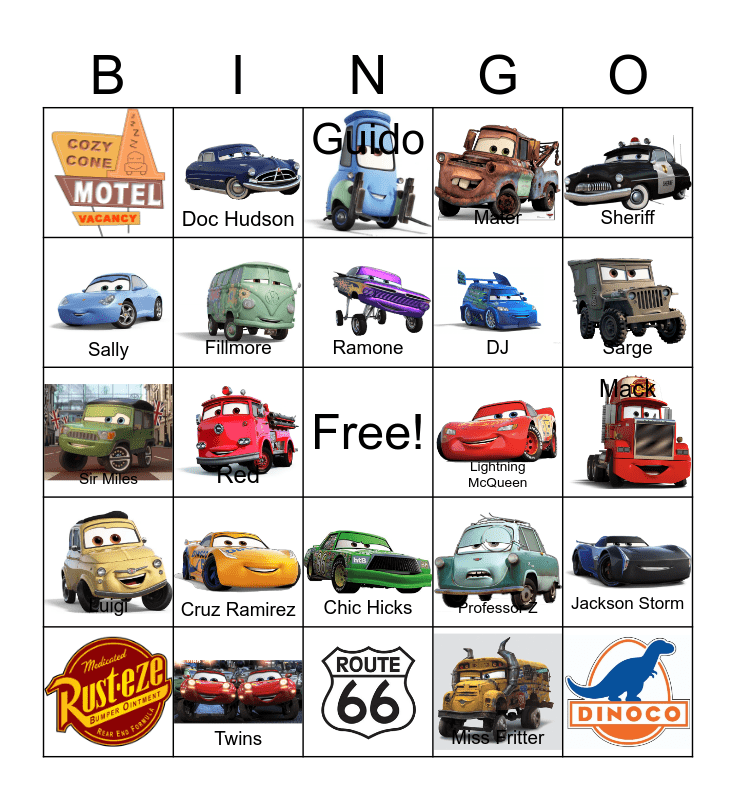 This bingo card has 24 images, a free space and 20 words: Cruz Ramirez, Twins, Ramone, Sheriff, Sally, Doc Hudson, Lightning McQueen, Chic Hicks, DJ, Sir Miles, Professor Z, Jackson Storm, Fillmore, Miss Fritter, Mack, Guido, Sarge, Red, Luigi and Mater.