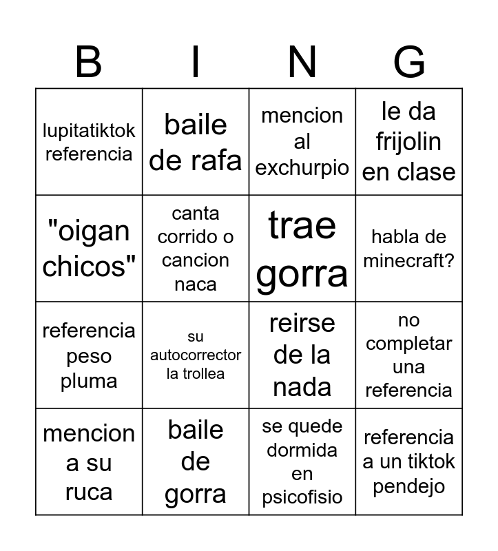 This bingo card has 16 words: baile de gorra, no completar una referencia, mencion al exchurpio, lupitatiktok referencia, referencia peso pluma, baile de rafa, reirse de la nada, se quede dormida en psicofisio, "oigan chicos", canta corrido o cancion naca, mencion a su ruca, le da frijolin en clase, su autocorrector la trollea, habla de minecraft?, trae gorra and referencia a un tiktok pendejo.