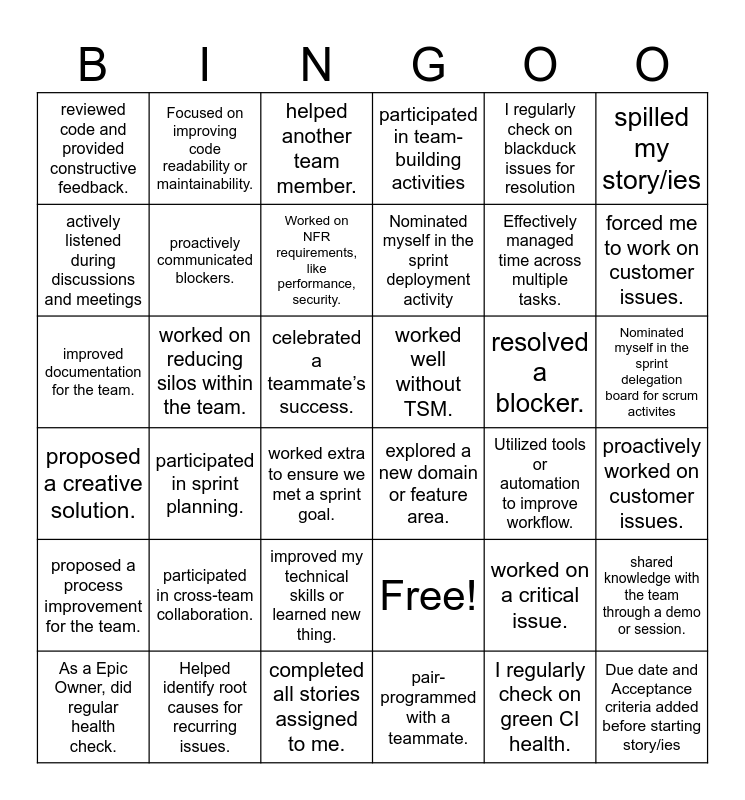 This bingo card has 36 words: Free!, improved my technical skills or learned new thing., pair-programmed with a teammate., actively listened during discussions and meetings, proposed a creative solution., worked well without TSM., proactively communicated blockers., completed all stories assigned to me., I regularly check on blackduck issues for resolution, worked on a critical issue., forced me to work on customer issues., participated in team-building activities, shared knowledge with the team through a demo or session., worked on reducing silos within the team., Nominated myself in the sprint deployment activity, reviewed code and provided constructive feedback., proposed a process improvement for the team., resolved a blocker., improved documentation for the team., helped another team member., celebrated a teammate’s success., participated in sprint planning., explored a new domain or feature area., worked extra to ensure we met a sprint goal., Utilized tools or automation to improve workflow., Focused on improving code readability or maintainability., Effectively managed time across multiple tasks., Helped identify root causes for recurring issues., Worked on NFR requirements, like performance, security., spilled my story/ies, Due date and Acceptance criteria added before starting story/ies, As a Epic Owner, did regular health check., proactively worked on customer issues., Nominated myself in the sprint delegation board for scrum activites, participated in cross-team collaboration. and I regularly check on green CI health..