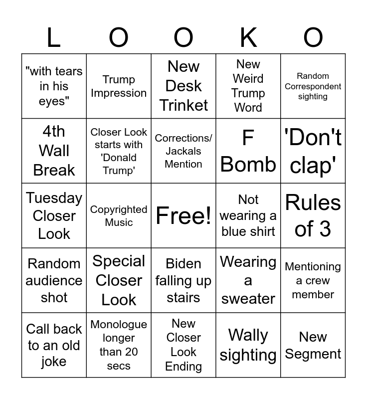 This bingo card has a free space and 34 words: Lindsey graham impression, Wally sighting, Seth laughs at his own joke, Segment within Closer Look, Random audience shot, Closer Look starts with 'Donald Trump', Random Correspondent sighting, Call back to an old joke, Trump Impression, Pencil/Pen taps, Corrections/ Jackals Mention, New Desk Trinket, A poorly photo- shopped photo, Rudy, Not wearing a blue shirt, 'Don't clap', Monologue longer than 20 secs, Tuesday Closer Look, Special Closer Look, Wearing a sweater, Biden falling up stairs, Non copyrighted music, "with tears in his eyes", Rules of 3, New Closer Look Ending, New Segment, New Weird Trump Word, Biden Impression, F Bomb, 4th Wall Break, Helicopter Interview, Copyrighted Music, Mentioning a crew member and Out of pocket impression.