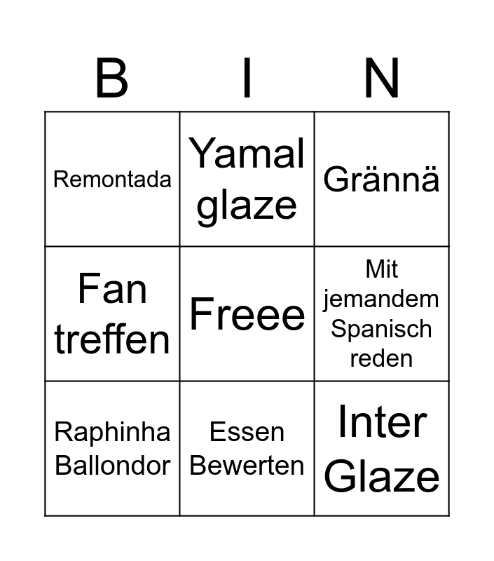 This bingo card has a free space and 8 words: Mit jemandem Spanisch reden, Grännä, Yamal glaze, Raphinha Ballondor, Remontada, Inter Glaze, Fan treffen and Essen Bewerten.
