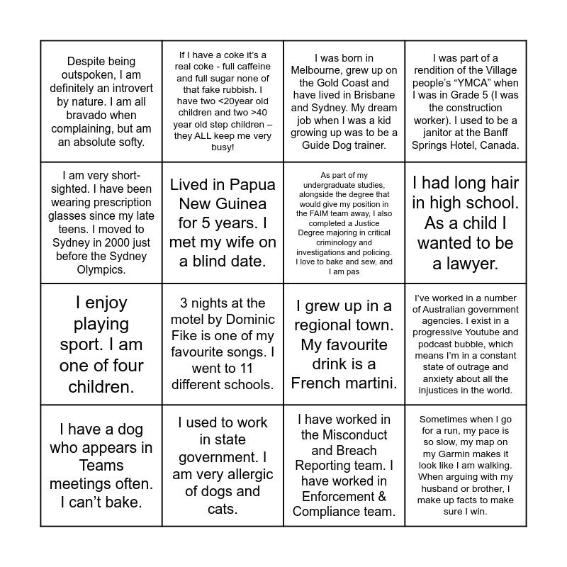 This bingo card has 21 words: I used to work in state government. I am very allergic of dogs and cats., Most would call me extroverted, although I would refer to myself as an ambivert. I have three dogs and hope to acquire more (crazy dog lady)., If I have a coke it’s a real coke - full caffeine and full sugar none of that fake rubbish. I have two <20year old children and two >40 year old step children – they ALL keep me very busy!, My ‘buddy’ when I started at ASIC was Leah. In my time at ASIC, I’ve had two different managers., I have worked in the Misconduct and Breach Reporting team. I have worked in Enforcement & Compliance team., As part of my undergraduate studies, alongside the degree that would give my position in the FAIM team away, I also completed a Justice Degree majoring in critical criminology and investigations and policing. I love to bake and sew, and I am pas, Despite being outspoken, I am definitely an introvert by nature. I am all bravado when complaining, but am an absolute softy., I was born in Melbourne, grew up on the Gold Coast and have lived in Brisbane and Sydney. My dream job when I was a kid growing up was to be a Guide Dog trainer., I grew up in a regional town. My favourite drink is a French martini., I had long hair in high school. As a child I wanted to be a lawyer., I enjoy playing sport. I am one of four children., I was part of a rendition of the Village people’s “YMCA” when I was in Grade 5 (I was the construction worker). I used to be a janitor at the Banff Springs Hotel, Canada., Sometimes when I go for a run, my pace is so slow, my map on my Garmin makes it look like I am walking. When arguing with my husband or brother, I make up facts to make sure I win., The nickname of everyone in my family is an abbreviated version of our surname. I love attending cooking classes, but never remake the dishes., Lived in Papua New Guinea for 5 years. I met my wife on a blind date., I play badminton. I was born in the Solomon Islands., I have a dog who appears in Teams meetings often. I can’t bake., 3 nights at the motel by Dominic Fike is one of my favourite songs. I went to 11 different schools., I am very short-sighted. I have been wearing prescription glasses since my late teens. I moved to Sydney in 2000 just before the Sydney Olympics., I’ve worked in a number of Australian government agencies. I exist in a progressive Youtube and podcast bubble, which means I’m in a constant state of outrage and anxiety about all the injustices in the world. and Enjoy crime thrillers and witty comedies. Love the ocean..