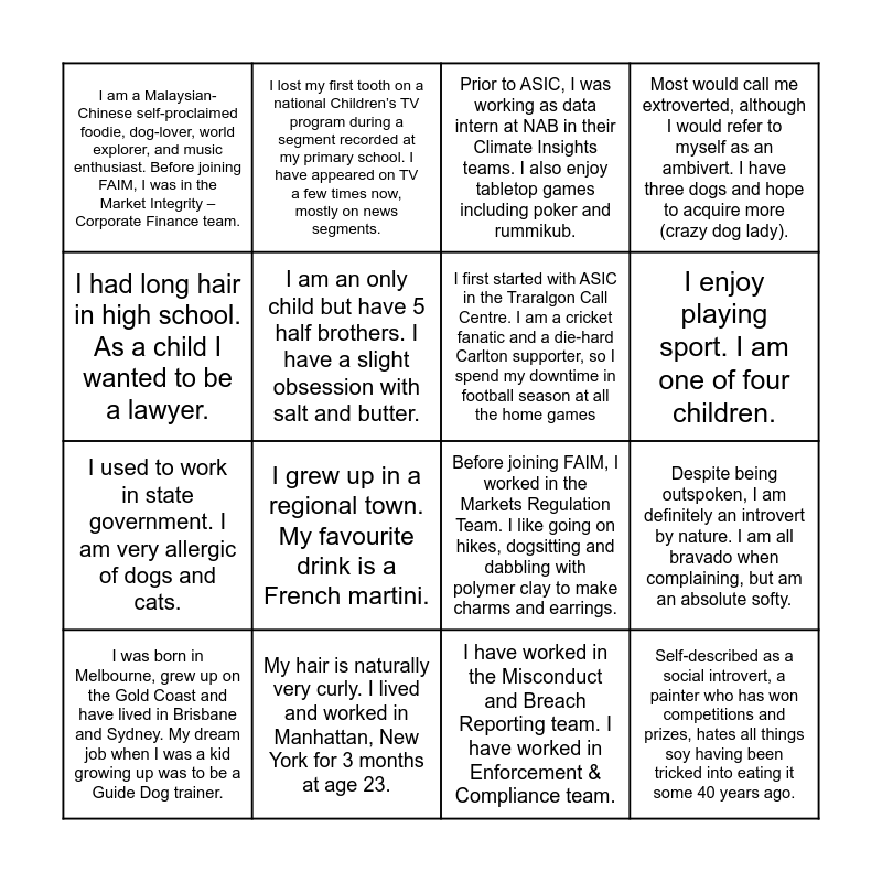 This bingo card has 22 words: My hair is naturally very curly. I lived and worked in Manhattan, New York for 3 months at age 23., My hobbies are chess, cooking, numismatics, snorkelling and reading. My favourite books are ‘The Foundation’ trilogy by Isaac Asimov., I lost my first tooth on a national Children’s TV program during a segment recorded at my primary school. I have appeared on TV a few times now, mostly on news segments., I am half Dutch. I was a fencer for a few years as a teenager., I am an only child but have 5 half brothers. I have a slight obsession with salt and butter., I first started with ASIC in the Traralgon Call Centre. I am a cricket fanatic and a die-hard Carlton supporter, so I spend my downtime in football season at all the home games, I am a Malaysian-Chinese self-proclaimed foodie, dog-lover, world explorer, and music enthusiast. Before joining FAIM, I was in the Market Integrity – Corporate Finance team., Prior to ASIC, I was working as data intern at NAB in their Climate Insights teams. I also enjoy tabletop games including poker and rummikub., Before joining FAIM, I worked in the Markets Regulation Team. I like going on hikes, dogsitting and dabbling with polymer clay to make charms and earrings., Self-described as a social introvert, a painter who has won competitions and prizes, hates all things soy having been tricked into eating it some 40 years ago., I used to work in state government. I am very allergic of dogs and cats., Most would call me extroverted, although I would refer to myself as an ambivert. I have three dogs and hope to acquire more (crazy dog lady)., If I have a coke it’s a real coke - full caffeine and full sugar none of that fake rubbish. I have two <20year old children and two >40 year old step children – they ALL keep me very busy!, My ‘buddy’ when I started at ASIC was Leah. In my time at ASIC, I’ve had two different managers., I have worked in the Misconduct and Breach Reporting team. I have worked in Enforcement & Compliance team., As part of my undergraduate studies, alongside the degree that would give my position in the FAIM team away, I also completed a Justice Degree majoring in critical criminology and investigations and policing. I love to bake and sew, and I am pas, Despite being outspoken, I am definitely an introvert by nature. I am all bravado when complaining, but am an absolute softy., I was born in Melbourne, grew up on the Gold Coast and have lived in Brisbane and Sydney. My dream job when I was a kid growing up was to be a Guide Dog trainer., I grew up in a regional town. My favourite drink is a French martini., I had long hair in high school. As a child I wanted to be a lawyer., I enjoy playing sport. I am one of four children. and I was part of a rendition of the Village people’s “YMCA” when I was in Grade 5 (I was the construction worker). I used to be a janitor at the Banff Springs Hotel, Canada..