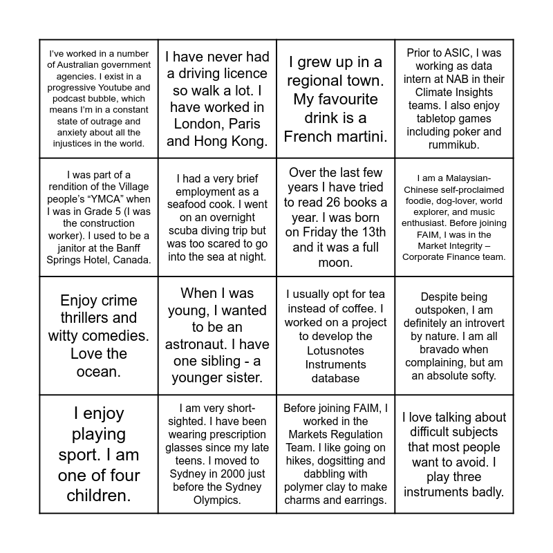 This bingo card has 20 words: Despite being outspoken, I am definitely an introvert by nature. I am all bravado when complaining, but am an absolute softy., I was born in Melbourne, grew up on the Gold Coast and have lived in Brisbane and Sydney. My dream job when I was a kid growing up was to be a Guide Dog trainer., I grew up in a regional town. My favourite drink is a French martini., I had long hair in high school. As a child I wanted to be a lawyer., I enjoy playing sport. I am one of four children., I was part of a rendition of the Village people’s “YMCA” when I was in Grade 5 (I was the construction worker). I used to be a janitor at the Banff Springs Hotel, Canada., I am very short-sighted. I have been wearing prescription glasses since my late teens. I moved to Sydney in 2000 just before the Sydney Olympics., I’ve worked in a number of Australian government agencies. I exist in a progressive Youtube and podcast bubble, which means I’m in a constant state of outrage and anxiety about all the injustices in the world., Enjoy crime thrillers and witty comedies. Love the ocean., I have never had a driving licence so walk a lot. I have worked in London, Paris and Hong Kong., When I was young, I wanted to be an astronaut. I have one sibling - a younger sister., I usually opt for tea instead of coffee. I worked on a project to develop the Lotusnotes Instruments database, I had a very brief employment as a seafood cook. I went on an overnight scuba diving trip but was too scared to go into the sea at night., I love talking about difficult subjects that most people want to avoid. I play three instruments badly., Over the last few years I have tried to read 26 books a year. I was born on Friday the 13th and it was a full moon., I first started with ASIC in the Traralgon Call Centre. I am a cricket fanatic and a die-hard Carlton supporter, so I spend my downtime in football season at all the home games, I am a Malaysian-Chinese self-proclaimed foodie, dog-lover, world explorer, and music enthusiast. Before joining FAIM, I was in the Market Integrity – Corporate Finance team., Prior to ASIC, I was working as data intern at NAB in their Climate Insights teams. I also enjoy tabletop games including poker and rummikub., Before joining FAIM, I worked in the Markets Regulation Team. I like going on hikes, dogsitting and dabbling with polymer clay to make charms and earrings. and Self-described as a social introvert, a painter who has won competitions and prizes, hates all things soy having been tricked into eating it some 40 years ago..