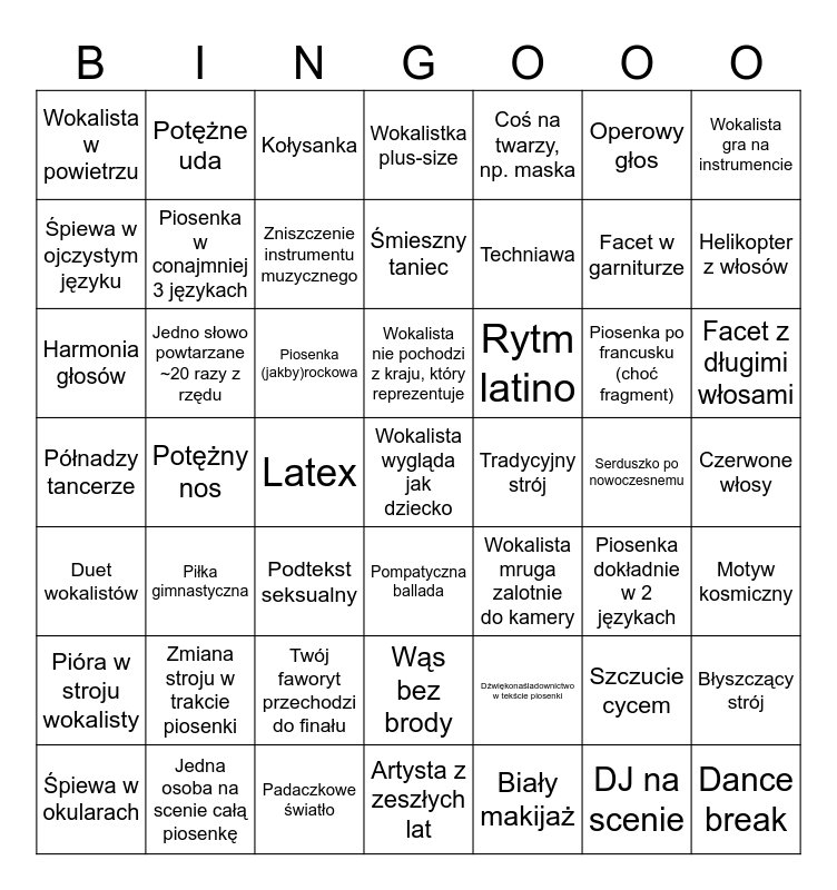 This bingo card has 63 words: Free!, Czerwone włosy, Rekordowe tipsy, Piosenka po francusku (choć fragment), Podtekst seksualny, Śpiewa w okularach, Potężne uda, Thank you, Europe!, Śpiewa w ojczystym języku, Jedna osoba na scenie całą piosenkę, Wokalista nie pochodzi z kraju, który reprezentuje, Dźwiękonaśladownictwo w tekście piosenki, Harmonia głosów, Coś na twarzy, np. maska, Fałszowanie, Operowy głos, Techniawa, Wokalista w powietrzu, Piosenka zmienia tempo conajmniej 5 razy, Piosenka w conajmniej 3 językach, Piosenka (jakby)rockowa, Jedno słowo powtarzane ~20 razy z rzędu, Wokalistka plus-size, Piłka gimnastyczna, Ironiczny tytuł, Piosenka dokładnie w 2 językach, Pompatyczna ballada, Pirotechnika, Serduszko po nowoczesnemu, Pióra w stroju wokalisty, Wiatr we włosach, Wąs bez brody, Dance break, Robotyczne ruchy, Zniszczenie instrumentu muzycznego, Facet z długimi włosami, Szczucie cycem, Latex, Motyw kosmiczny, Wokalista gra na instrumencie, Śmieszny taniec, Helikopter z włosów, Błyszczący strój, Komuś burczy w brzuchu, Facet w garniturze, Półnadzy tancerze, Wokalista wygląda jak dziecko, Rytm latino, Padaczkowe światło, Biały makijaż, DJ na scenie, Potężny nos, Duet wokalistów, Zachęcanie widowni do śpiewu, Śpiewanie „Yum yum”, Kołysanka, Twój faworyt przechodzi do finału, Wokalista mruga zalotnie do kamery, Zmiana stroju w trakcie piosenki, Artysta z zeszłych lat, Zalotne mrugnięcie do kamery, Tradycyjny strój and Wygwizdywanie / buczenie z widowni.