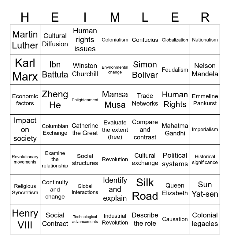 This bingo card has a free space and 48 words: Silk Road, Feudalism, Industrial Revolution, Columbian Exchange, Enlightenment, Imperialism, Cultural Diffusion, Social Contract, Globalization, Revolution, Nationalism, Colonialism, Human Rights, Trade Networks, Religious Syncretism, Mahatma Gandhi, Karl Marx, Nelson Mandela, Queen Elizabeth, Confucius, Simon Bolivar, Catherine the Great, Martin Luther, Ibn Battuta, Sun Yat-sen, Winston Churchill, Emmeline Pankurst, Henry VIII, Mansa Musa, Zheng He, Causation, Compare and contrast, Historical significance, Continuity and change, Impact on society, Cultural exchange, Political systems, Economic factors, Social structures, Global interactions, Revolutionary movements, Colonial legacies, Human rights issues, Technological advancements, Environmental change, Identify and explain, Examine the relationship and Describe the role.