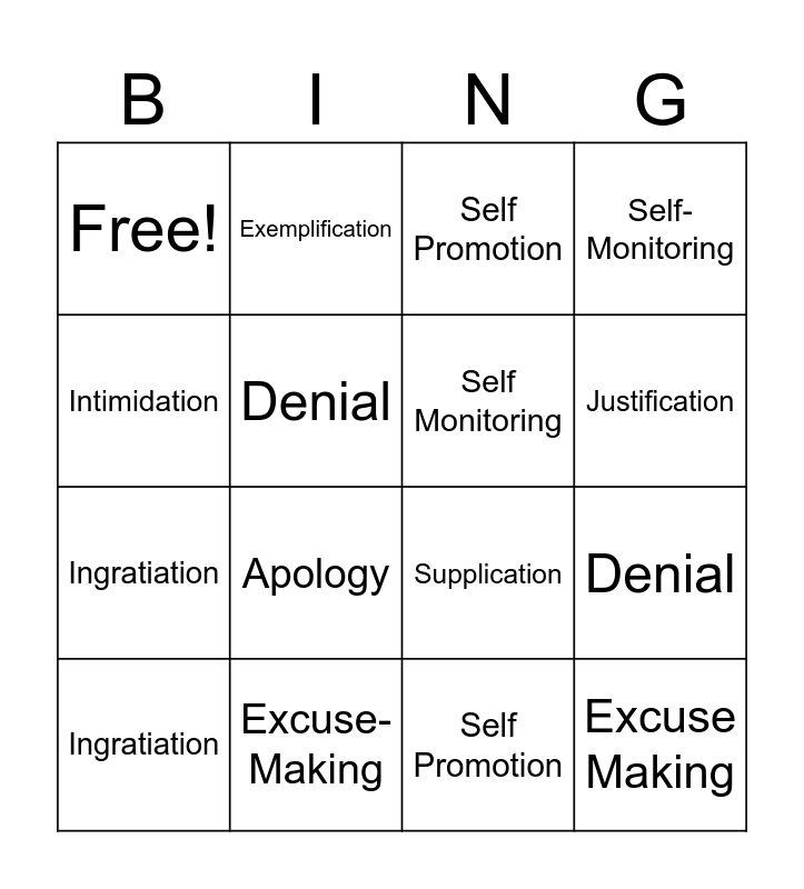 This bingo card has 16 words: Ingratiation, Excuse-Making, Self Promotion, Self-Monitoring, Intimidation, Exemplification, Supplication, Denial, Free!, Denial, Self Promotion, Justification, Ingratiation, Apology, Self Monitoring and Excuse Making.