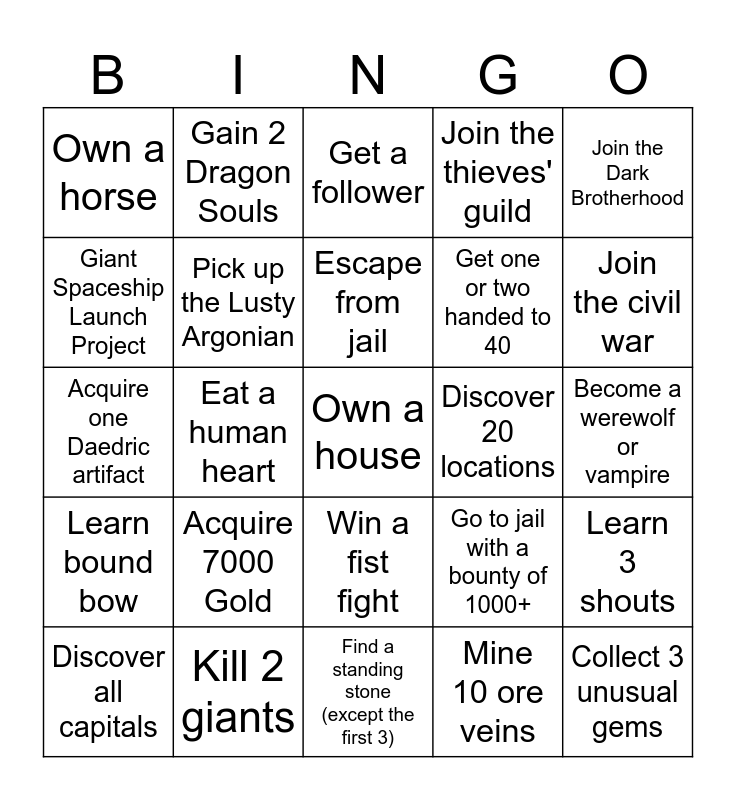 This bingo card has 25 words: Learn bound bow, Kill 2 giants, Own a house, Mine 10 ore veins, Join the Dark Brotherhood, Own a horse, Gain 2 Dragon Souls, Get a follower, Discover 20 locations, Learn 3 shouts, Giant Spaceship Launch Project, Pick up the Lusty Argonian, Find a standing stone (except the first 3), Go to jail with a bounty of 1000+, Join the civil war, Discover all capitals, Eat a human heart, Escape from jail, Get one or two handed to 40, Become a werewolf or vampire, Acquire one Daedric artifact, Acquire 7000 Gold, Win a fist fight, Join the thieves' guild and Collect 3 unusual gems.