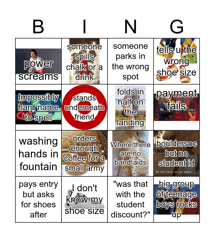 This bingo card has 12 images and 16 words: I don't know my shoe size, bouldersoc but no student id, someone parks in the wrong spot, power screams, washing hands in fountain, someone spills chalk or a drink, Where/there are no band-aids, "was that with the student discount?", Impossibly hard name to spell, stands underneath friend, pays entry but asks for shoes after, tells u the wrong shoe size, orders enough coffee for a small army, payment fails, folds in half on the landing and big group of teenage boys rocks up.