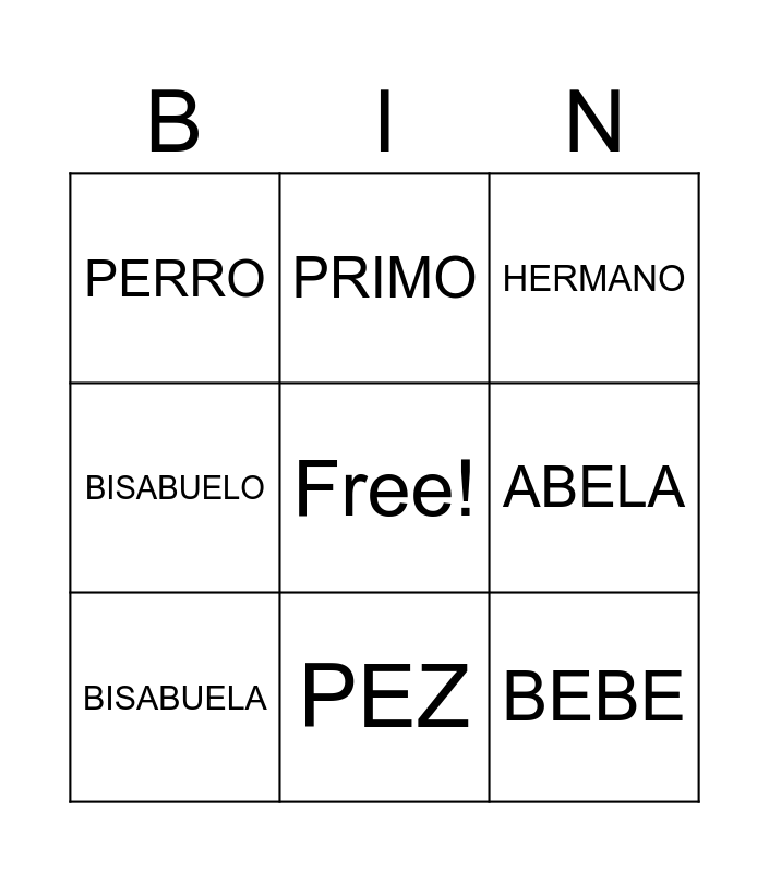 This bingo card has a free space and 15 words: AMIGO, GATO, HERMANO, PERRO, PEZ, BEBE, PAPA, MAMA, ABELA, ABUELO, HERMANA, BISABUELO, BISABUELA, PRIMO and PRIMA.
