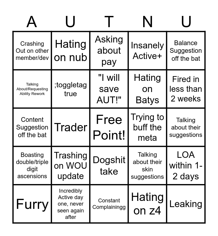 This bingo card has a free space and 24 words: Trashing on WOU update, Incredibly Active day one, never seen again after, "I will save AUT!", Furry, Balance Suggestion off the bat, Crashing Out on other member/dev, Talking About/Requesting Ability Rework, Hating on nub, Trying to buff the meta, Dogshit take, Hating on Batys, Content Suggestion off the bat, Talking about their skin suggestions, LOA within 1-2 days, ;toggletag true, Hating on z4, Talking about their suggestions, Asking about pay, Fired in less than 2 weeks, Trader, Leaking, Boasting double/triple digit ascensions, Insanely Active+ and Constant Complainingg.