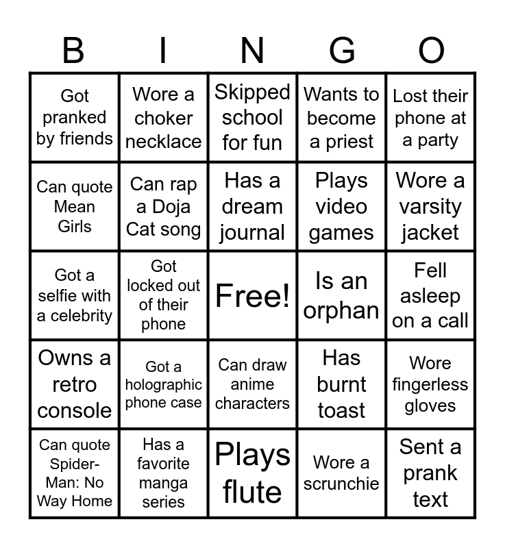 This bingo card has a free space and 317 words: LEFT Handed, Favorite Fruit is Mango, Have Played Flag Football, Loves mint chocolate chip ice cream, Is Wearing green, Plays a outside sport, Loves mozzarella sticks, Has seen a teacher outside school time, Never been Seasick, Fallen asleep somewhere not in a bed, Has a Nickname, Has more than Two Siblings, Seen someone barefoot @ Walmart, Traveled Outside the U.S., Been Sky Diving Before, Has 8 cousins, Been swimming in a ocean, Seen Movie Ironman, Loves Pasta, Loves to Wake Up Early, Owns a car, Has cooked dinner, First Job was McDonalds, Been to Dallas, Has seen the Minecraft movie, Can hold their breath for 1 minute, Rode in CYBERTRUCK, Wants to become a priest, Wants to become a nun, Wants to become a mother, Wants to become a father, Can cook pasta, Has burnt toast, Has travelled internationally, Has read St. Thomas Aquinas, Can remember three quotes from the Bible, Memorized all books of the Bible, Is an Altar Boy, Is in a choir, Has gotten stitches before, Plays piano, Plays guitar, Plays ukelele, Plays accordion, Plays vibraphone, Plays drums, Plays flute, Plays tuba, Plays clarinet, Has an email, Has an iPhone, Has a Samsung Phone, Has a Google Phone, Orders from the secret menu, Fell off a boat, Hiked in Tahoe, Been to San Francisco, Been on a plane, Been to a hospital, Has a girlfriend, Has a boyfriend, Is wearing muted blue, Is an orphan, Binge-watched a Netflix anime, Nailed a TikTok dance challenge, Rode in a friend’s Tesla, Wants to be a Twitch streamer, Posted a viral Instagram Reel, Snuck food into a movie theater, Can quote Spider-Man: No Way Home, Wore pajamas to a Zoom class, Plays Fortnite daily, Has a secret Spotify playlist, Failed a Snapchat streak, Got banned from a Discord server, Tried a Starbucks secret menu drink, Made a Minecraft mod, Has a crush on a K-pop idol, Wore AirPods all day, Lost a bet on a Roblox game, Can rap a Doja Cat song, Skipped school for a concert, Has a custom phone case, Dyed their hair a bold color, Got caught texting in class, Owns a Hydro Flask with stickers, Watched a sunset on FaceTime, Can solve a Rubik’s Cube, Sent a risky DM, Has a YouTube channel, Wore Crocs to school2, Tried a viral food hack, Has a gaming setup with LEDs, Fell asleep during an online class, Can name all Kardashian siblings, Got a piercing in secret, Made a friendship bracelet, Has a Polaroid wall, Lost their phone at a party, Can do a skateboard trick, Watched every Marvel movie, Has a secret Tumblr blog, Tried bubble tea with friends, Wore fake nails for prom, Has a signed band poster, Got detention for being late, Can draw anime characters, Has a thrift store outfit, Watched a Twitch stream for hours, Owns a pair of chunky sneakers, Made a Spotify Wrapped meme, Has a pet named after a celebrity, Skipped a song on aux, Got a shoutout on Instagram Live, Can quote Mean Girls, Tried to learn Korean, Has a custom Snapchat Bitmoji, Stayed up for a game release, Wore a hoodie for a week, Has a favorite ASMR channel, Got ghosted in a group chat, Can do a backflip, Has a stan Twitter account, Ate ramen at midnight, Wore sunglasses indoors, Has a favorite manga series, Lost a Kahoot game, Can play a BTS song on guitar, Got a speeding ticket, Has a secret Wattpad story, Wore a choker necklace, Watched a sunset on a roof, Has a Funko Pop collection, Tried a viral makeup trend, Can name all One Direction songs, Got locked out of their phone, Has a favorite food truck, Skipped homework for TikTok, Wore a bucket hat, Has a signed yearbook, Can moonwalk, Got a summer job, Has a favorite e-boy/e-girl, Tried to make Dalgona coffee, Has a playlist for their crush, Wore ripped jeans to church, Can name all Pokémon starters, Got a text from an ex, Has a favorite VSCO filter, Watched a skateboarding fail, Tried a new sport for fun, Has a secret handshake, Wore a tie-dye shirt, Can quote The Office, Got a selfie with a celebrity, Has a favorite meme page, Tried to learn a magic trick, Wore a beanie in summer, Has a favorite TikTok sound, Got pranked by friends, Can do a handstand, Has a favorite food delivery app, Wore a scrunchie, Watched a viral TikTok, Has a favorite emoji, Rode a skateboard, Wants to be famous, Ate pizza this week, Visited an arcade, Can sing a pop song, Wore a hoodie, Plays video games, Has a pet dog, Texted past midnight, Has a Snapchat streak, Drank boba tea, Built a Minecraft house, Listens to rap music, Owns wireless earbuds, Lost a phone charger, Can dance a little, Skipped breakfast, Has a favorite app, Dyed their hair, Got caught daydreaming, Owns a water bottle, Watched a sunset, Can whistle, Sent a funny meme, Has a YouTube subscription, Wore sneakers, Tried a food challenge, Has fairy lights, Fell asleep in class, Knows a celebrity fact, Got a new piercing, Made a paper airplane, Has a favorite show, Lost their keys, Can ride a bike, Watched a superhero movie, Has a blog, Ate sushi, Wore a necklace, Has a band poster, Got in trouble, Can draw cartoons, Wore a jacket, Watched a live stream, Owns cool socks, Made a playlist, Has a pet hamster, Skipped a song, Got a high-five, Can quote a movie, Tried a new language, Has a favorite game, Watched a UFO documentary, Has a lucky charm, Rode a hoverboard, Wants to be a DJ, Ate sushi with chopsticks, Visited a haunted house, Can mimic an accent, Wore neon socks, Plays VR games, Has a pet snake, Texted a celebrity, Has a secret TikTok, Drank a glowing energy drink, Built an epic Roblox map, Listens to lo-fi beats, Owns a lava lamp, Lost their wallet, Can do a magic trick, Skipped school for fun, Has a favorite conspiracy, Bleached their hair, Got caught singing loudly, Owns a skateboard deck, Watched stars at night, Can juggle fruit, Sent a prank text, Has a rare vinyl record, Wore platform shoes, Tried a weird food combo, Has a neon sign, Fell asleep on a call, Knows an alien fact, Got a temporary tattoo, Made a stop-motion video, Has a favorite anime, 