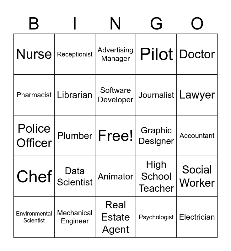 This bingo card has a free space and 24 words: Data Scientist, Mechanical Engineer, Software Developer, Environmental Scientist, Doctor, Nurse, Pharmacist, Receptionist, Graphic Designer, Animator, Journalist, Police Officer, High School Teacher, Social Worker, Librarian, Psychologist, Accountant, Advertising Manager, Lawyer, Plumber, Electrician, Chef, Pilot and Real Estate Agent.