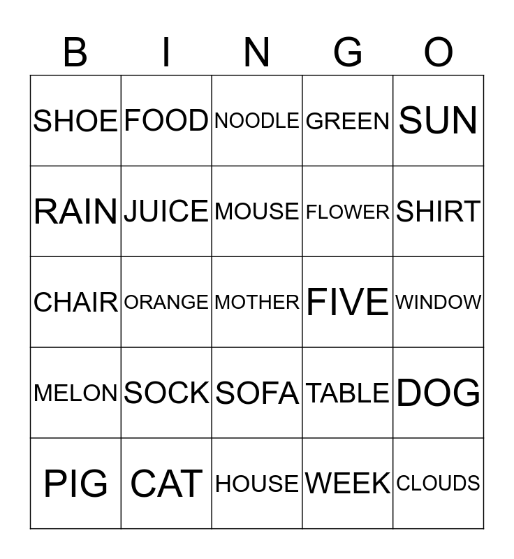 This bingo card has 25 words: SOCK, HOUSE, MOUSE, PIG, SUN, SHOE, RAIN, FOOD, FIVE, SOFA, FLOWER, CHAIR, TABLE, DOG, JUICE, CLOUDS, WINDOW, NOODLE, SHIRT, ORANGE, MOTHER, CAT, MELON, GREEN and WEEK.