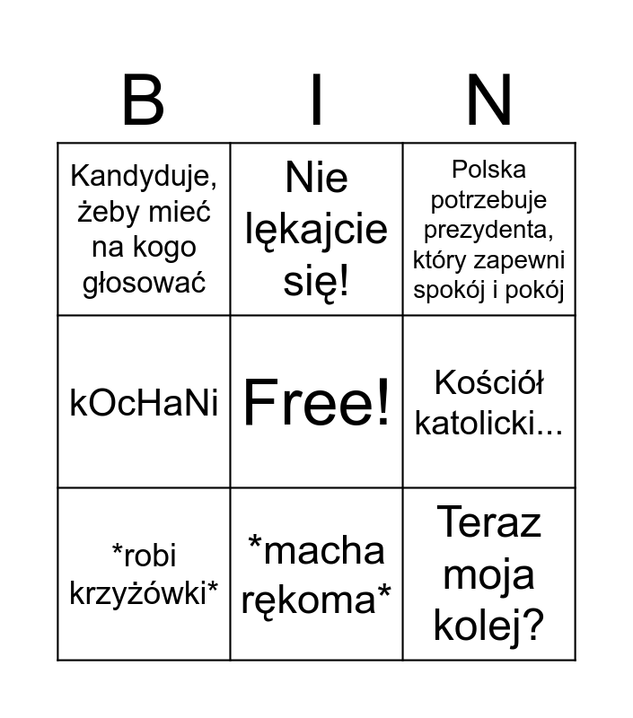 This bingo card has a free space and 8 words: kOcHaNi, Nie lękajcie się!, Kościół katolicki..., *robi krzyżówki*, Polska potrzebuje prezydenta, który zapewni spokój i pokój, Kandyduje, żeby mieć na kogo głosować, *macha rękoma* and Teraz moja kolej?.