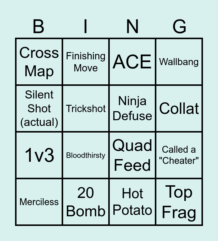 This bingo card has 16 words: 20 Bomb, Called a "Cheater", ACE, Cross Map, 1v3, Finishing Move, Quad Feed, Hot Potato, Silent Shot (actual), Trickshot, Merciless, Wallbang, Bloodthirsty, Collat, Ninja Defuse and Top Frag.
