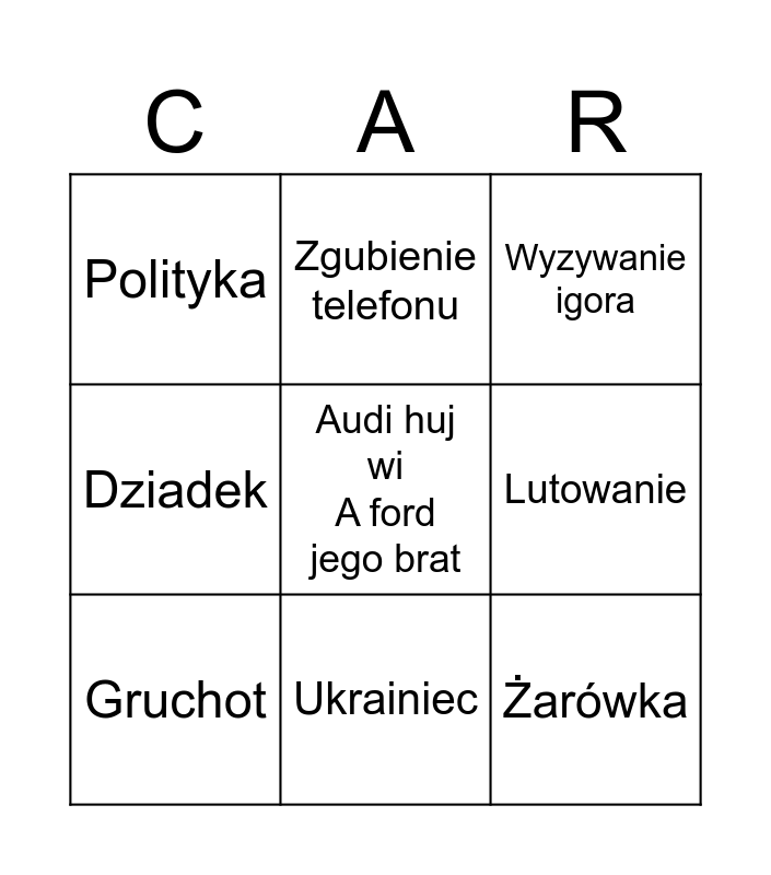 This bingo card has a free space and 8 words: Lutowanie, Wyzywanie igora, Zgubienie telefonu, Gruchot, Polityka, Żarówka, Dziadek and Ukrainiec.