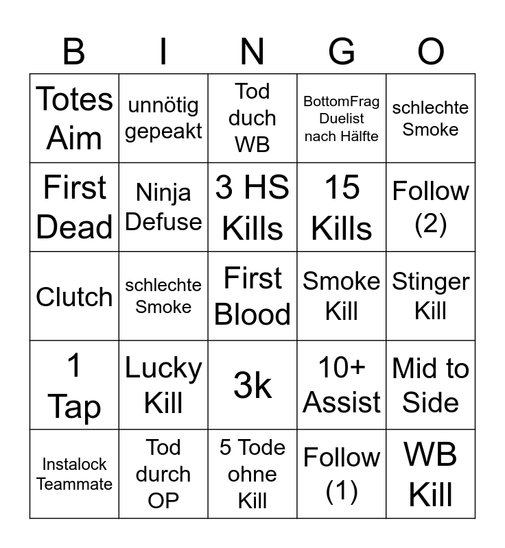 This bingo card has a free space and 24 words: Lucky Kill, Tod durch OP, 3 HS Kills, Instalock Teammate, schlechte Smoke, Totes Aim, First Dead, unnötig gepeakt, Smoke Kill, 3k, 15 Kills, Clutch, 10+ Assist, Mid to Side, Ninja Defuse, Follow (1), Stinger Kill, Tod duch WB, Follow (2), schlechte Smoke, WB Kill, 1 Tap, BottomFrag Duelist nach Hälfte and 5 Tode ohne Kill.
