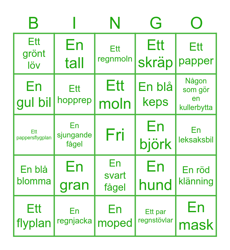 This bingo card has a free space and 39 words: En kotte, En gul blomma, En fotboll, Ett hopprep, Ett flyplan, En svart fågel, Ett moln, En bok, Ett papper, En blå blomma, En sjungande fågel, Ett skräp, En mask, En leksaksbil, En björk, En gran, En penna, Ett grönt löv, En cyklist, En hund, En gul bil, En moped, En blå keps, Någon som gör en kullerbytta, En lastbil, Någon som kan göra spagat, Någon som kan hjula, Någon som kan stå på händerna, En grön keps, En tall, Ett sudd, En rosa blomma, Ett regnmoln, En regnjacka, Ett par regnstövlar, Ett paraply, En röd klänning, Ett pappersflygplan and Ett gosedjur.