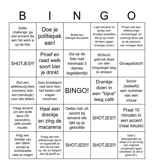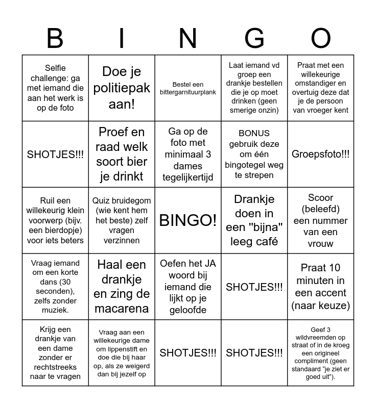 This bingo card has a free space and 24 words: Haal een drankje en zing de macarena, Vraag aan een willekeurige dame om lippenstift en doe die bij haar op, als ze weigerd dan bij jezelf op, Ga op de foto met minimaal 3 dames tegelijkertijd, Krijg een drankje van een dame zonder er rechtstreeks naar te vragen, Praat met een willekeurige omstandiger en overtuig deze dat je de persoon van vroeger kent, Selfie challenge: ga met iemand die aan het werk is op de foto, SHOTJES!!!, Doe je politiepak aan!, Drankje doen in een ''bijna'' leeg café, Oefen het JA woord bij iemand die lijkt op je geloofde, BONUS gebruik deze om één bingotegel weg te strepen, Ruil een willekeurig klein voorwerp (bijv. een bierdopje) voor iets beters, SHOTJES!!!, Praat 10 minuten in een accent (naar keuze), Proef en raad welk soort bier je drinkt, SHOTJES!!!, Scoor (beleefd) een nummer van een vrouw, Bestel een bittergarnituurplank, Groepsfoto!!!, Quiz bruidegom (wie kent hem het beste) zelf vragen verzinnen, Geef 3 wildvreemden op straat of in de kroeg een origineel compliment (geen standaard “je ziet er goed uit”)., Vraag iemand om een korte dans (30 seconden), zelfs zonder muziek., Laat iemand vd groep een drankje bestellen die je op moet drinken (geen smerige onzin) and SHOTJES!!!.