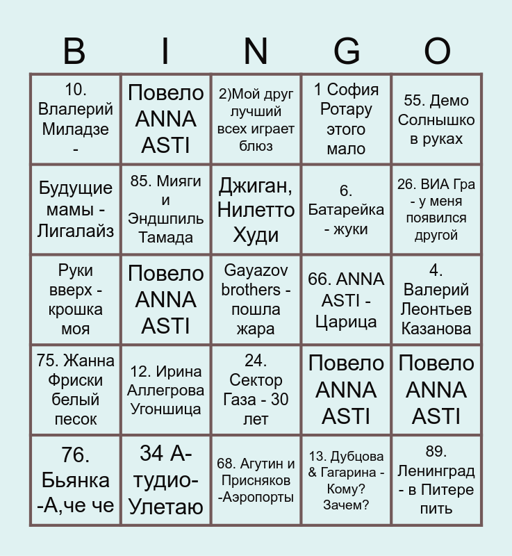 This bingo card has a free space and 156 words: Повело ANNA ASTI, Нежность моя - Валерия, Бобр SLAVA SKRIPKA, Дима Билан - я твой номер один, ANNA ASTI Царица, Валентин Стрыкало - Яхта, парус, Рюмка водки на столе - Григорий Лепс, Орбит без сахара - Сплин, Надежда Кадышева и Золотое кольцо - Плывет Веночек, Тахмина Умалатова - твоя любовь Манила, Ленинград - WWW, Моя игра - Баста, Руки вверх - крошка моя, Аромат твоих волос - RUBI, Будущие мамы - Лигалайз, Джиган, Нилетто Худи, Hamali Navai - пустите меня на танцпол, Артур пирожков зацепила, Ты такой - DONI feat. Натали, Где прошла ты - Кравц, Гио Пика, Баста - Я найду тебя через века, Рок-острова - ничего не говори, Maksim - знаешь ли ты, Дискотека Авария - Если хочешь остаться, Повело ANNA ASTI, Повело ANNA ASTI, Повело ANNA ASTI, Повело ANNA ASTI, Повело ANNA ASTI, Повело ANNA ASTI, Повело ANNA ASTI, Повело ANNA ASTI, Повело ANNA ASTI, Повело ANNA ASTI, Повело ANNA ASTI, Повело ANNA ASTI, Повело ANNA ASTI, Повело ANNA ASTI, Повело ANNA ASTI, Повело ANNA ASTI, Повело ANNA ASTI, Повело ANNA ASTI, Повело ANNA ASTI, Повело ANNA ASTI, Повело ANNA ASTI, Повело ANNA ASTI, Повело ANNA ASTI, Повело ANNA ASTI, Повело ANNA ASTI, Повело ANNA ASTI, Повело ANNA ASTI, Повело ANNA ASTI, Повело ANNA ASTI, Повело ANNA ASTI, Повело ANNA ASTI, 1 София Ротару этого мало, 2. Алла Пугачёва -, 1 Любовь похожая на сон, 2 доченька моя, 3 мадам брошкинА, 3. Юрий Антонов Мечта сбывается, 4. Валерий Леонтьев Казанова, 5. ВИА "Земляне" Трава у дома, 6. Батарейка - жуки, 7. Кино - Группа крови, 8. Машина Времени - 1)Поворот, 2)Мой друг лучший всех играет блюз, 3)За тех кто в море, 9. В соседнее село на дискотеку, 10. Влалерий Миладзе -, 1) салют, вера 2) самбо белого матылька, 11. Шуфутинский 3 сентября, 12. Ирина Аллегрова Угоншица, 13. Дубцова & Гагарина - Кому? Зачем?, 14. Наташа Королёва Позвони мне ,позвони, 15. Мираж музыка нас связала, 16. Руки Вверх – 18 мне уже 2(крошка моя), 17. Лолита на Титанике, 18. Любовь Успенская Гитара, 19. Мумий Тролль медведица, 20. Иванушки International -, 1)Тополиный пух, 2)кукла Маша, 21 Ах какая женщина, 22. Кристина Орбакайте пьяная вишня, 23. Верка Сердючка -, 1 тук тук тук, 2 все будет хорошо, 3 Евровидение, 24. Сектор Газа - 30 лет, 25. К/ф Брильянтовая рука-песня про зайца, 26. ВИА Гра - у меня появился другой, 27. Полякова -1)Шлепки 2) Королева ночи, 28. Вдруг как сказке (разговор со счастьем), 29. Юрий Шатунов - былые розы, 30. пропаганда-я яблоки ела?, 31. Максим - Знаешь ли ты, 32. Би-2 - Полковнику никто не пишет?, 33. Город 312 - Останусь, 34 А-тудио-Улетаю, 35. Верка Сердючка и группа ВИА Гра я не поняла, 36. Вера Брежнева Любовь спасёт мир, 37. Дима Билан - На берегу неба?, 38. Звери - Районы-кварталы, 39. Ёлка - Прованс, 40. Монатик - Кружит, 41. Макс Барских - Туманы, 42. Полина Гагарина - Кукушка, 43. Светлана Лобода Твои глаза, 44. Билык-о, любви, 45. Андрей Губин -девушки как звезды, 46. Иван Дорн - Неррі Eng, 47. Федорико, Фелини?, 48. Баста - Сансара, 49. Наргиз в Фадеев - Мовдвоем, 50. Видели ночь, гуляли всю ночь до утра, 51. Пицца - солдат, 52. Егор Крид - Самая Самая, 53. Мари Краймбрери - пьяную, 54. Катя Бужинская романсеро, 55. Демо Солнышко в руках, 56. Zivert -Кредо, 57. Ария я свободен, 58. Дарите женщинам цветы, 59. Ваенга Курю, 60. Филипп Киркоров зайка моя, 61.Бьянка и Н.Каменских стиль собачки, 62. Не ангелы роман, 63. Одесса МАМА, 64. Мурад Черные глаза, 65. Блестящие за четыре моря, 66. ANNA ASTI - Царица, 67. Мот и Бьянка- Абсолютно все, 68. Агутин и Присняков -Аэропорты, 69. Серебро, мама люба, 70. Тимати -Баклажан, 71. Земфира - Лондон, 72. Валерия - Часики, 73. Стас Михайлов Всё для тебя, 74. Рефлекс - Танцы, 75. Жанна Фриски белый песок, 76. Бьянка -А,че че, 77. Слава - Одиночество