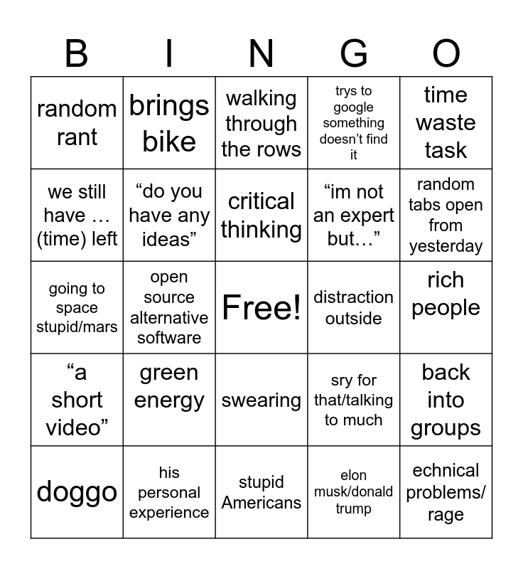 This bingo card has a free space and 24 words: doggo, green energy, critical thinking, elon musk/donald trump, time waste task, random rant, brings bike, walking through the rows, distraction outside, rich people, going to space stupid/mars, “do you have any ideas”, sry for that/talking to much, back into groups, we still have …(time) left, his personal experience, stupid Americans, trys to google something doesn’t find it, random tabs open from yesterday, “a short video”, open source alternative software, swearing, “im not an expert but…” and echnical problems/ rage.