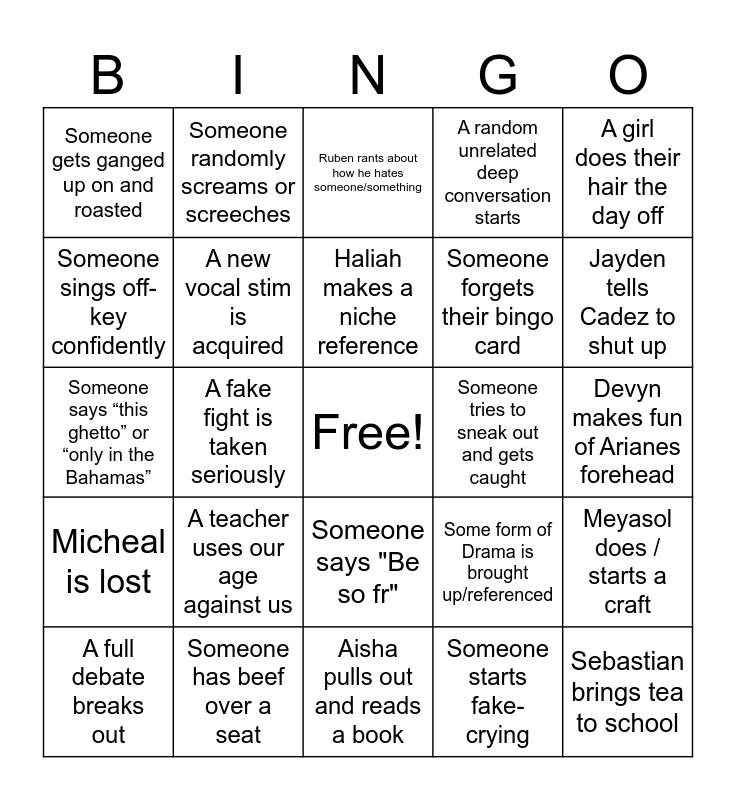 This bingo card has a free space and 27 words: Some form of Drama is brought up/referenced, A lowkey racist joke is made, Someone forgets their bingo card, Aisha pulls out and reads a book, Someone sings off-key confidently, Ruben rants about how he hates someone/something, Someone randomly screams or screeches, Micheal is lost, Someone tries to sneak out and gets caught, Meyasol does / starts a craft, Someone says “this ghetto” or “only in the Bahamas”, A random unrelated deep conversation starts, A full debate breaks out, Someone has beef over a seat, Jayden tells Cadez to shut up, Someone eats someone else’s food without asking, A new vocal stim is acquired, Haliah makes a niche reference, A teacher uses our age against us, Someone gets ganged up on and roasted, Devyn makes fun of Arianes forehead, Someone starts fake-crying, A fake fight is taken seriously, Sebastian brings tea to school, Someone says "Be so fr", A girl does their hair the day off and Someone gets too serious during a joke and kills the vibe.