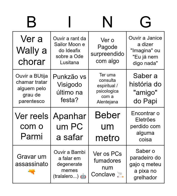 This bingo card has 16 words: Ouvir a Bambi a falar em degenerate memes (tralalero...) 🤖, Encontrar o Eletrões perdido com alguma coisa, Ver o Pagode surpreendido com algo, Ver a Wally a chorar, Ver reels com o Parmi, Ouvir a rant da Sailor Moon e do Ideafix sobre a Ode Lusitana, Beber um metro, Ver os PCs fumadores num Conclave 🚬, Ouvir a BUtija chamar tratar alguem pelo grau de parentesco, Punkzão vs Visigodo último na festa?, Gravar um assassinato 🔫, Ouvir a Janice a dizer "Imagina" ou "Eu já nem digo nada", Apanhar um PC a safar, Saber a história do "amigo" do Papi, Ter uma consulta espiritual / psicologica com a Alentejana and Saber o paradeiro do gajo q meteu a pixa no grelhador.