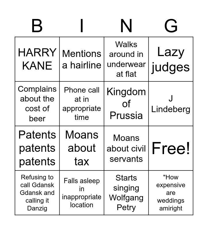 This bingo card has 20 words: Free!, Says how Gdansk is German, Walks around in underwear at flat, Jangry, Refusing to call Gdansk Gdansk and calling it Danzig, Complains about the cost of beer, Falls asleep in inappropriate location, HARRY KANE, Patents patents patents, Mentions a hairline, Moans about tax, Moans about civil servants, Phone call at in appropriate time, "How expensive are weddings amiright, Kingdom of Prussia, Forgets how to speak English, J Lindeberg, Lazy judges, Starts singing Wolfgang Petry and Talks about how Poland is living on German money.
