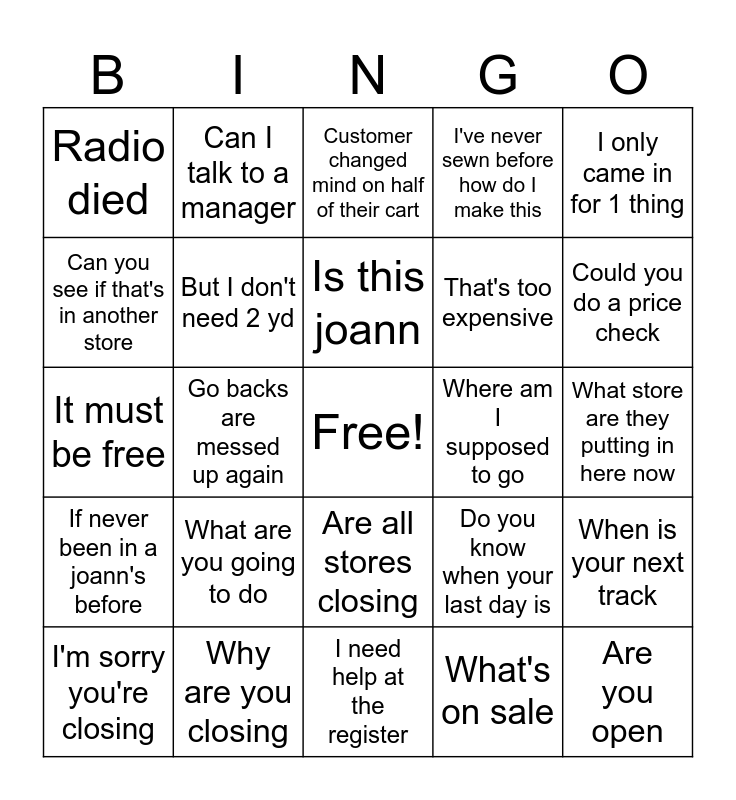 This bingo card has a free space and 31 words: I need help at the register, When will the price drop, Go backs are messed up again, Is there anything in the back, Radio died, Customer changed mind on half of their cart, But I don't need 2 yd, Do you know when your last day is, Where am I supposed to go, What's on sale, What store are they putting in here now, Are you open, Back up at cut counter, Register fails, Could you do a price check, Do you guys feel ticket guards, When is your next track, What are you going to do, If never been in a joann's before, Are all stores closing, I only came in for 1 thing, Fixture sale/question, I'm sorry you're closing, Can I talk to a manager, That's too expensive, Can you see if that's in another store, I've never sewn before how do I make this, It must be free, Why are you closing, Is this joann and Will you be getting more of this.