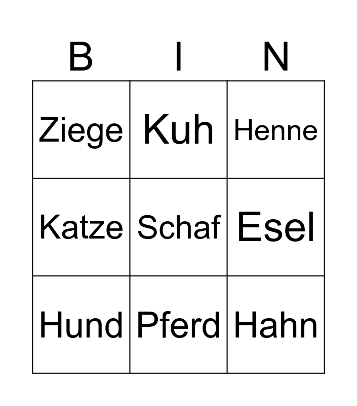 This bingo card has a free space and 8 words: Katze, Kuh, Esel, Hund, Henne, Ziege, Pferd and Hahn.