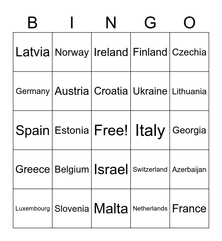 This bingo card has a free space and 37 words: Albania, Armenia, Australia, Austria, Azerbaijan, Belgium, Croatia, Cyprus, Czechia, Denmark, Estonia, Finland, France, Georgia, Germany, Greece, Iceland, Ireland, Israel, Italy, Latvia, Lithuania, Luxembourg, Malta, Montenegro, Netherlands, Norway, Poland, Portugal, San Marino, Serbia, Slovenia, Spain, Sweden, Switzerland, Ukraine and United Kingdom.