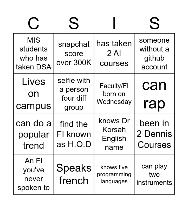 This bingo card has 17 words: knows five programming languages, An FI you've never spoken to, has taken 2 AI courses, MIS students who has taken DSA, find the FI known as H.O.D, someone without a github account, been in 2 Dennis Courses, Faculty/FI born on Wednesday, can rap, selfie with a person four diff group, Speaks french, knows Dr Korsah English name, Lives on campus, snapchat score over 300K, can do a popular trend, someone who took a class with an FI whiles the FI was a student and can play two instruments.