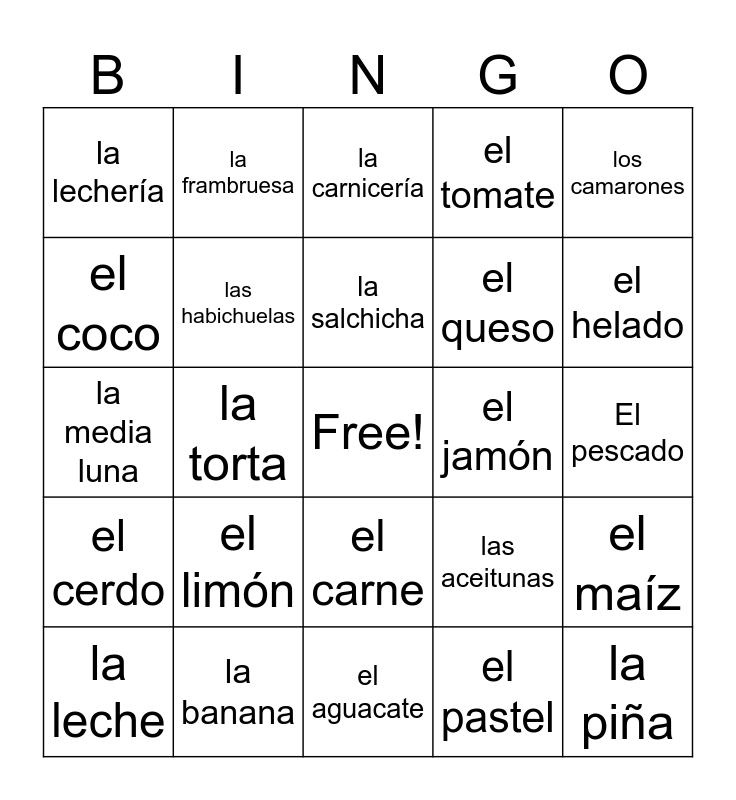This bingo card has a free space and 50 words: la fresa, la piña, el pomelo, el aguacate, el limón, la pera, la frambruesa, la cereza, el coco, las zanahorias, las habichuelas, el tomate, el maíz, las aceitunas, la sandía, el pollo, la salchicha, el jamón, la pescadería, los camarones, la torta, el pastel, la lechería, el queso, el yogur, la mantequilla, el helado, los huevos, la carnicería, el carne, el bistec, la langosta, las patatas, las judías verdes, la banana, la naranja, la manzana, el melocotón, las uvas, El pescado, El pan, la barra de pan, El cangrejo, la crema, la leche, la media luna, el pan chocolate, el pavo, el cerdo and la panadería.