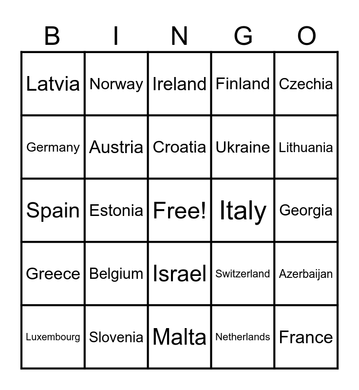This bingo card has a free space and 37 words: Albania, Armenia, Australia, Austria, Azerbaijan, Belgium, Croatia, Cyprus, Czechia, Denmark, Estonia, Finland, France, Georgia, Germany, Greece, Iceland, Ireland, Israel, Italy, Latvia, Lithuania, Luxembourg, Malta, Moldova, Netherlands, Norway, Poland, Portugal, San Marino, Serbia, Slovenia, Spain, Sweden, Switzerland, Ukraine and United Kingdom.