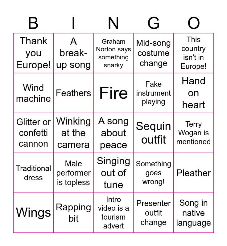 This bingo card has 35 words: Someone in the audience with flag face paint, Feathers, Synchronised dance routine, Feathers, Singing out of tune, Mid-song costume change, Wind machine, Fake rain, Fire, Clappy bit, Glitter or confetti cannon, This country isn't in Europe!, Key change, Contestant cries happy tears, Thank you Europe!, Sequin outfit, Presenter outfit change, Winking at the camera, Traditional dress, A song about peace, Something goes wrong!, Wings, Pleather, Rapping bit, Graham Norton says something snarky, Hand on heart, Song in native language, Dance break, Fake instrument playing, Terry Wogan is mentioned, Ridiculous hat, Intro video is a tourism advert, Male performer is topless, A break-up song and Presenter outfit change.