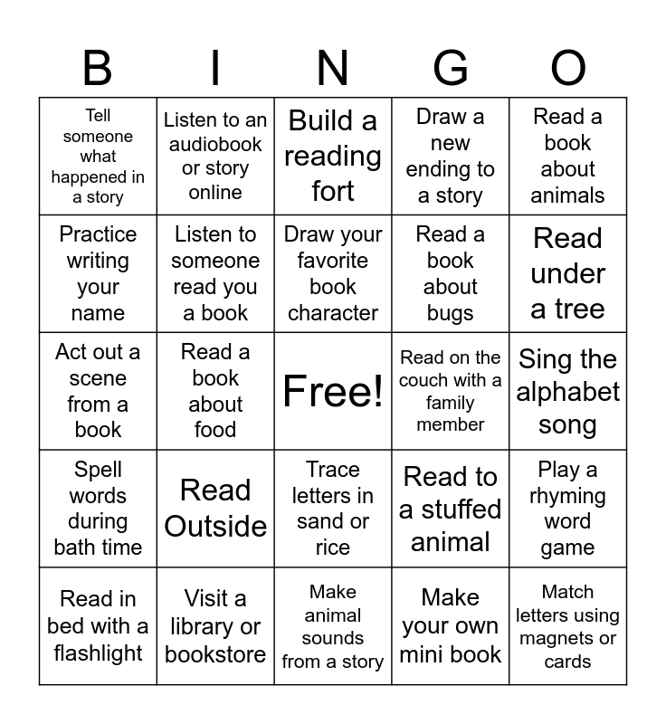 This bingo card has a free space and 24 words: Read Outside, Visit a library or bookstore, Draw your favorite book character, Read in bed with a flashlight, Read a book about animals, Tell someone what happened in a story, Practice writing your name, Listen to an audiobook or story online, Read on the couch with a family member, Trace letters in sand or rice, Read a book about bugs, Act out a scene from a book, Read to a stuffed animal, Play a rhyming word game, Listen to someone read you a book, Make your own mini book, Sing the alphabet song, Build a reading fort, Read under a tree, Read a book about food, Match letters using magnets or cards, Spell words during bath time, Draw a new ending to a story and Make animal sounds from a story.