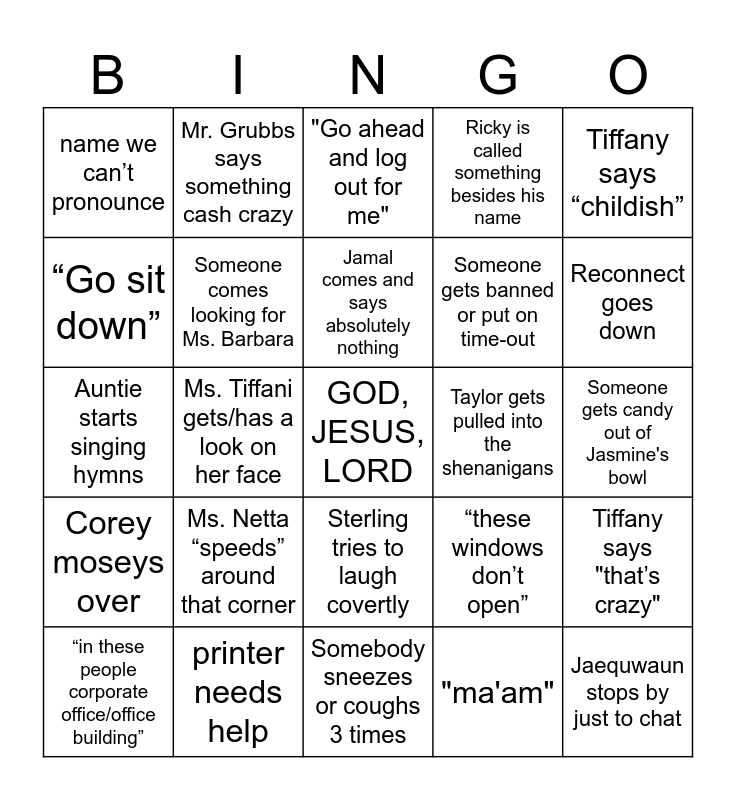 This bingo card has a free space and 24 words: Ms. Netta “speeds” around that corner, printer needs help, Jamal comes and says absolutely nothing, “in these people corporate office/office building”, Tiffany says “childish”, name we can’t pronounce, “Go sit down”, Mr. Grubbs says something cash crazy, Taylor gets pulled into the shenanigans, Sterling tries to laugh covertly, Someone gets banned or put on time-out, Auntie starts singing hymns, “these windows don’t open”, Tiffany says "that’s crazy", Someone comes looking for Ms. Barbara, "ma'am", Someone gets candy out of Jasmine's bowl, "Go ahead and log out for me", Reconnect goes down, Ms. Tiffani gets/has a look on her face, Jaequwaun stops by just to chat, Corey moseys over, Ricky is called something besides his name and Somebody sneezes or coughs 3 times.