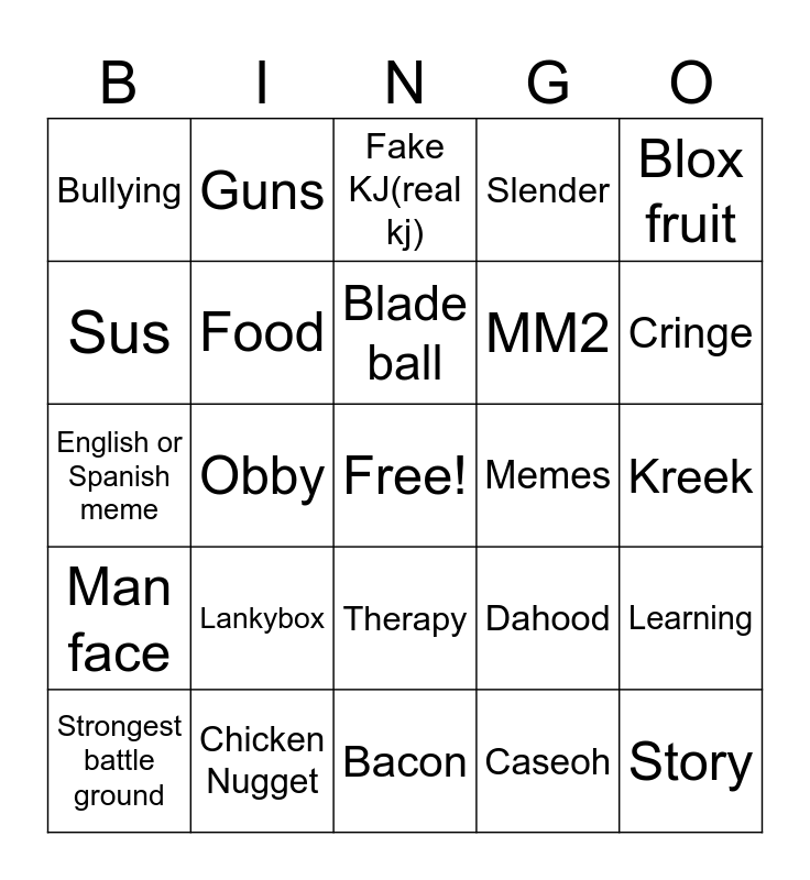 This bingo card has a free space and 24 words: Lankybox, Chicken Nugget, Blade ball, Strongest battle ground, Blox fruit, Bullying, Sus, Guns, Memes, Therapy, MM2, English or Spanish meme, Dahood, Learning, Food, Caseoh, Kreek, Fake KJ(real kj), Cringe, Obby, Story, Man face, Slender and Bacon.