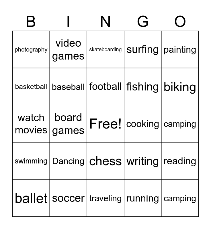 This bingo card has a free space and 24 words: Dancing, soccer, football, ballet, painting, photography, basketball, video games, cooking, chess, fishing, watch movies, writing, reading, baseball, running, camping, skateboarding, biking, board games, camping, swimming, surfing and traveling.