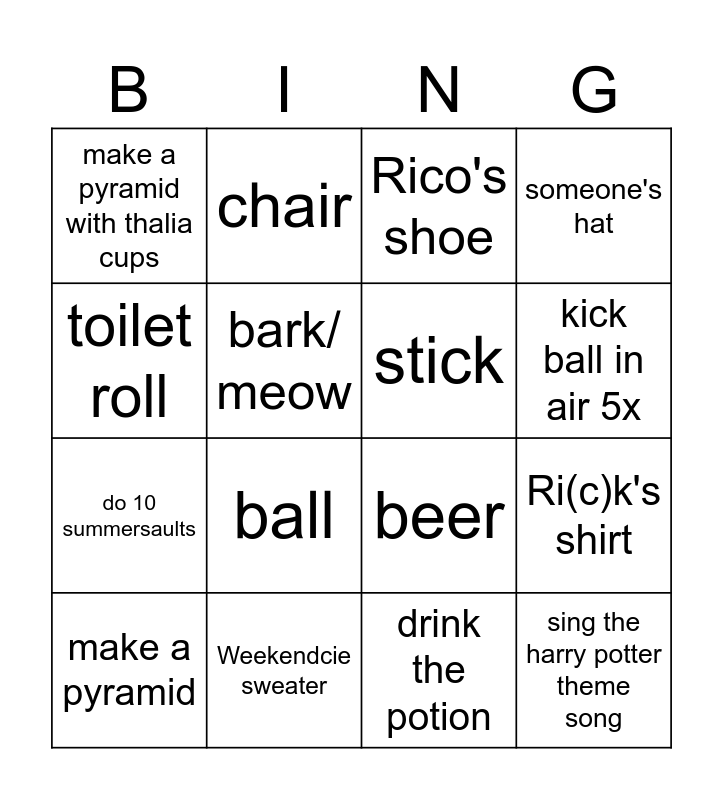 This bingo card has 16 words: Weekendcie sweater, Ri(c)k's shirt, Rico's shoe, make a pyramid with thalia cups, do 10 summersaults, chair, beer, drink the potion, toilet roll, bark/ meow, make a pyramid, someone's hat, ball, kick ball in air 5x, stick and sing the harry potter theme song.