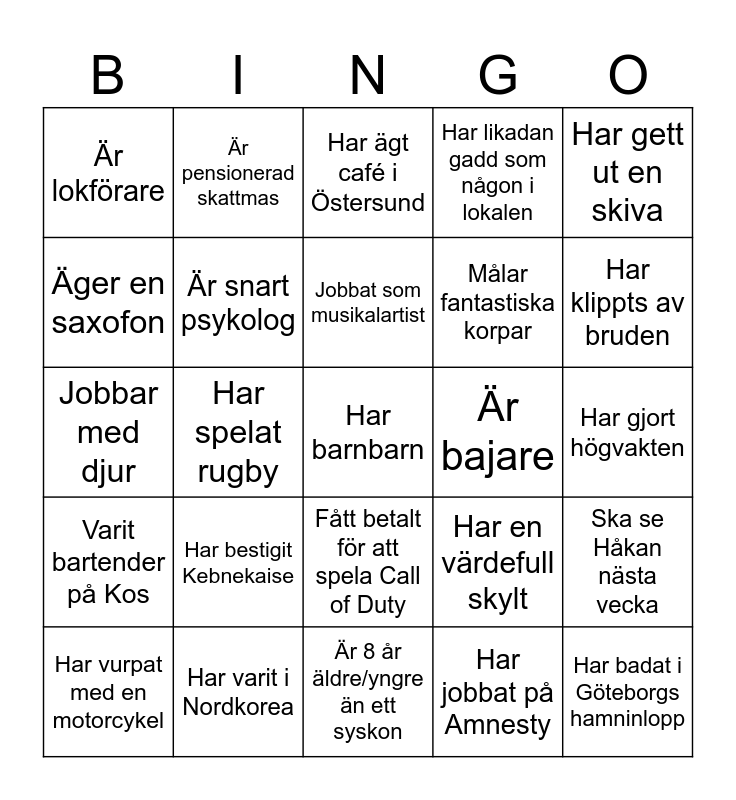 This bingo card has a free space and 24 words: Har bestigit Kebnekaise, Har varit i Nordkorea, Jobbat som musikalartist, Har vurpat med en motorcykel, Har gett ut en skiva, Är lokförare, Äger en saxofon, Är pensionerad skattmas, Är bajare, Fått betalt för att spela Call of Duty, Målar fantastiska korpar, Jobbar med djur, Har en värdefull skylt, Ska se Håkan nästa vecka, Är snart psykolog, Har jobbat på Amnesty, Har gjort högvakten, Har ägt café i Östersund, Har klippts av bruden, Har spelat rugby, Har badat i Göteborgs hamninlopp, Varit bartender på Kos, Har likadan gadd som någon i lokalen and Är 8 år äldre/yngre än ett syskon.