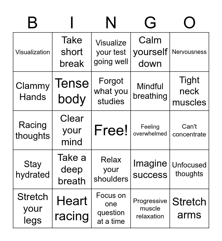 This bingo card has a free space and 24 words: Take a deep breath, Heart racing, Forgot what you studies, Stretch your legs, Nervousness, Visualization, Clammy Hands, Take short break, Feeling overwhelmed, Relax your shoulders, Mindful breathing, Racing thoughts, Imagine success, Unfocused thoughts, Tense body, Progressive muscle relaxation, Can't concentrate, Visualize your test going well, Tight neck muscles, Clear your mind, Stretch arms, Stay hydrated, Calm yourself down and Focus on one question at a time.
