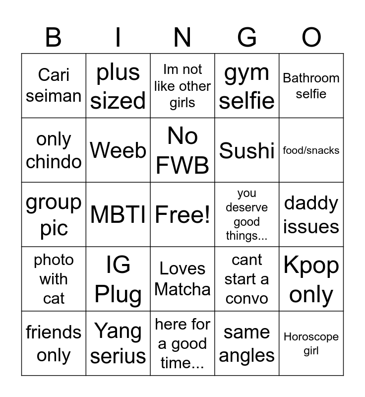 This bingo card has a free space and 24 words: IG Plug, Yang serius, No FWB, friends only, Bathroom selfie, Cari seiman, only chindo, plus sized, you deserve good things..., Loves Matcha, Sushi, group pic, cant start a convo, Kpop only, Weeb, same angles, daddy issues, Im not like other girls, food/snacks, MBTI, Horoscope girl, photo with cat, gym selfie and here for a good time....