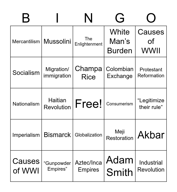 This bingo card has a free space and 24 words: Bismarck, “Gunpowder Empires”, Champa Rice, Causes of WWI, Causes of WWII, Mercantilism, Socialism, Mussolini, Consumerism, Globalization, Colombian Exchange, Nationalism, Meji Restoration, Akbar, Migration/ immigration, Adam Smith, “Legitimize their rule”, The Enlightenment, Protestant Reformation, Haitian Revolution, Industrial Revolution, Imperialism, White Man’s Burden and Aztec/Inca Empires.